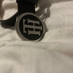 Ett svart läderbälte med ett silverfärgat spänne. Bältet har flera hål för justering. Läderbältet är i fint skick och insmort med ekologisk olja nyligen.