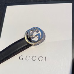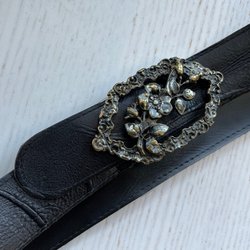 Svart midjebälte med tre spännen på varje sida. Bältet är brett och format för att framhäva midjan.