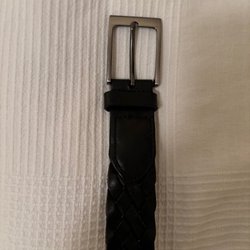Flätat konjaksfärgat läderbälte, 98 cm långt, med metallspänne.