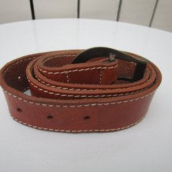 Ett brunt bälte med ett silverfärgat spänne. Längd 100 cm inklusive spänne, bredd 2,5 cm, 7 stycken hål.