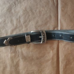 Ett svart bälte med ett dekorativt silverfärgat spänne och en silverfärgad spets. Bältet har ett mönster längs med hela bältet.