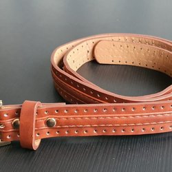 Ett brunt läder bälte med ett silverfärgat spänne. Bältet har dekorativa sömmar längs kanterna och en justerbar spännmekanism.