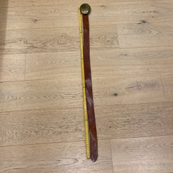 Ett brunt bälte med ett silverfärgat spänne. Längd 100 cm inklusive spänne, bredd 2,5 cm, 7 stycken hål.
