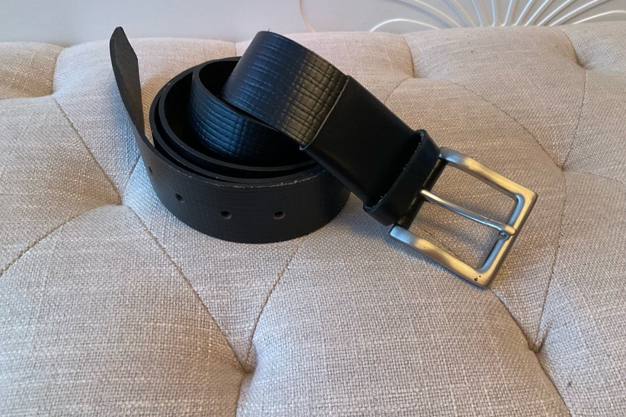 Ett svart bälte med ett silverfärgat spänne. Bältet har en slät yta med en lätt textur. Längd 125 cm. Konstläder.