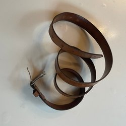 Brunt bälte med ett antikt guldspänne. Bältet har en texturerad yta och synliga sömmar längs kanterna. Spännet har en klassisk oval form.