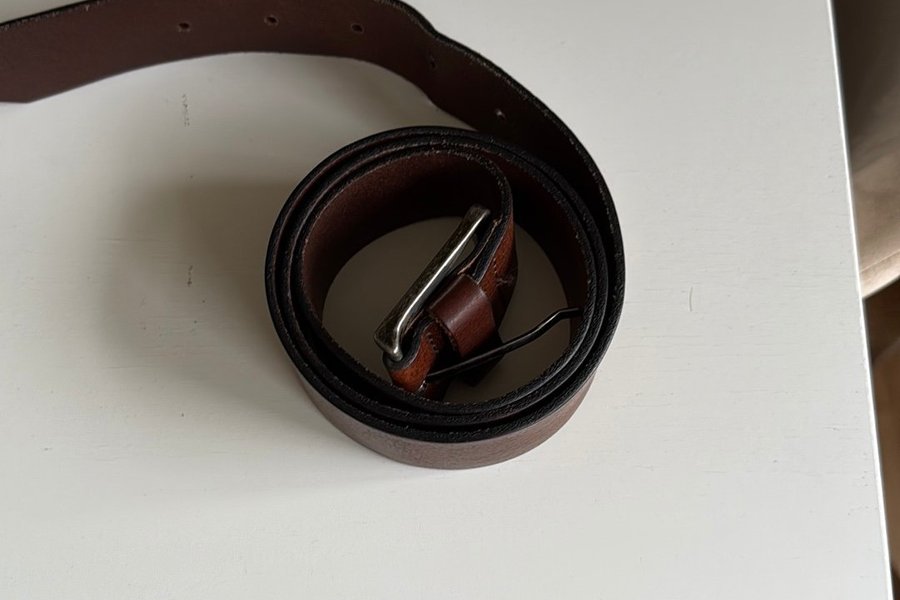 Ett brunt bälte med ett silverfärgat spänne. Bältet är rullat ihop på en vit yta.