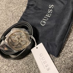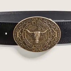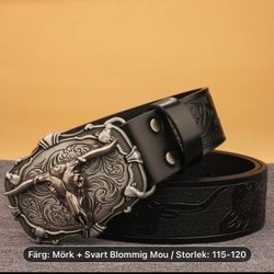 Ett svart bälte med ett rejält silverfärgat spänne. Bältet har flera hål för justering.