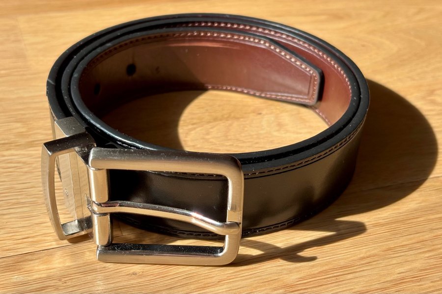 Ett svart bälte med ett silverfärgat spänne. Bältet har en slät yta och en enkel design som gör det lämpligt för olika tillfällen. Bältets insida är brun.