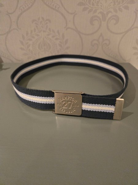 Ett stilrent bälte i mörkblått och vitt med ett silverfärgat spänne. Spännet har en präglad text "Hampton Republic N.Y. 27 U.S.A.". 82 cm, ej resår.
