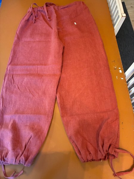 Ett par medeltida byxor i en rost nyans. Byxorna har en lös passform med dragsko i midjan och vid bensluten, vilket skapar en rynkad effekt. Midja 63 cm, innerben 82 cm. Hemsydda