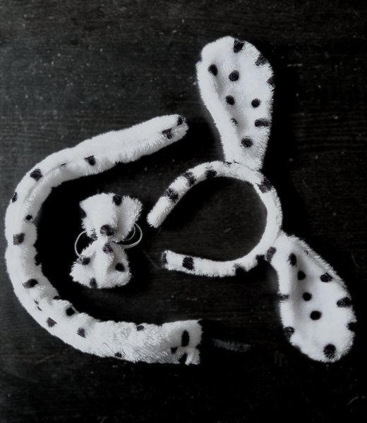 Set med dalmatiner-tema för utklädning. Innehåller ett diadem med öron, en svans och en fluga.