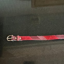 Ett smalt rött bälte med ett silverfärgat spänne. Bältet har flera hål för justering.