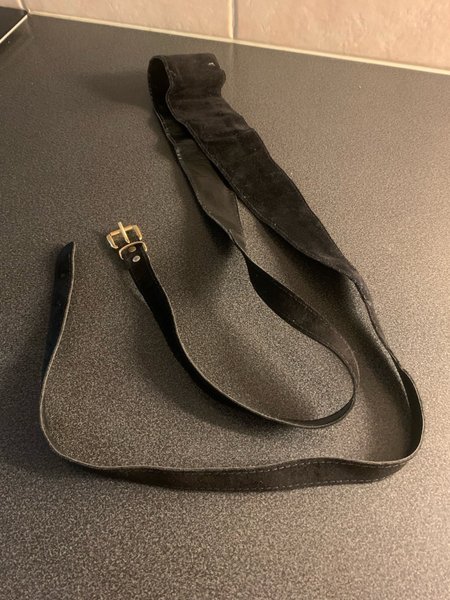 Snyggt svart bälte i sammet med guldfärgad spänne. Bältet är väldigt långt och behöver viras 1 varv runt kroppen innan det fästes i spännet. Passar bra till olika outfits, perfekt för att addera en touch av elegans till din stil.