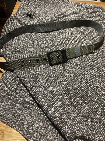 Ett grönt bälte med ett svart spänne. Bältet har hål för justering. Helt nytt. Starkt arbetsbälte eller till jakt vardags