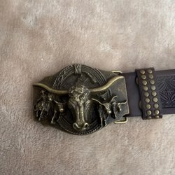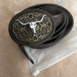 Ett brunt bälte med ett dekorativt guldspänne. Bältet är ca 110cm långt utan spännet.