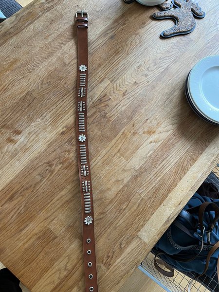 Ett brunt bälte med silverfärgade detaljer i form av blommor, rektanglar och runda nitar. Bältet har ett silverfärgat spänne och flera hål för justering. 90 cm
