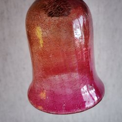 Fönsterlampa med en skärm i frostat glas med röda detaljer och ett mässingsfärgat fäste. Lampan ger ett behagligt sken