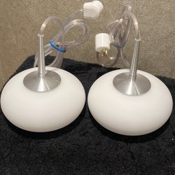 Ett par fönsterlampor med skärmar i färgat glas. Lamporna har en design som liknar en blomma eller lilja, med en färgövergång från orange till grön. De är försedda med sladd och stickkontakt.