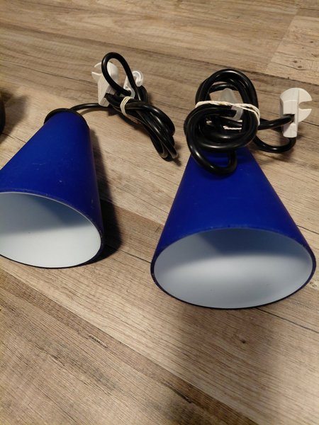 Två taklampor i en konformad design. Lamporna är blåa på utsidan och vita på insidan. De har svarta kablar och vita kontakter.