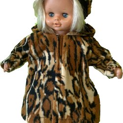Detta är en kappa med huva, sydd i cerise fleece, knäpps fram med kardborrband. Mössa och tossor hör till, sydda i samma fleece.