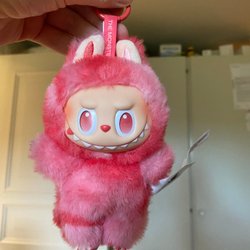 Säljer en outfit till Labubu. Setet innehåller en vit t-shirt med texten 'Supstar' och ett par beiga byxor. Observera att skor och väska inte ingår.