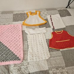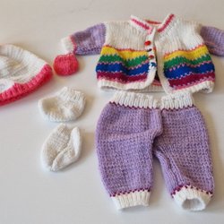Dockkläder, handstickade av Sonia. Varje uppsättning är unik i kombination av färger och knappar. De är bedårande att ha på prydnadsdockor, men är även underbara att leka med.