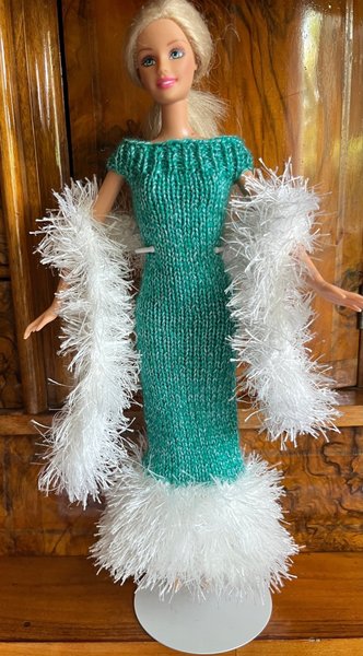 Fin klänning med tillhörande boa, stickad i ett tunt mjukt babygarn samt pälsgarn. Stickade kläder är lätta för små fingrar att ta av och på. Garnet jag stickar i är tunt vilket gör plagget finare än med grövre garn. Mycket välstickad.