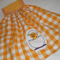 Ett set med dockkläder bestående av en klänning och ett par skor. Klänningen är turkos med vita detaljer och har ett broderat motiv. Skorna är stickade i turkos och vitt./silver klänningen stängs bak med kardborreband