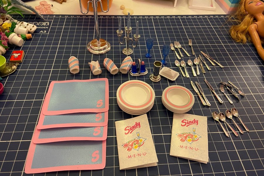 Dockservis med tallrikar, bestick, glas, menyer och tillbehör. Saknas 2 glas, blommor till vasen samt en lång kniv.