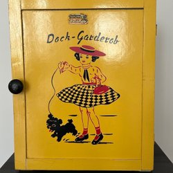Dockgarderob med två lådor. Tapetserad invändigt med omslagspapper. 43 cm hög, 27 cm bred och 16 cm djup.