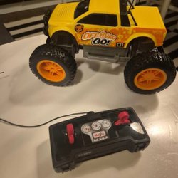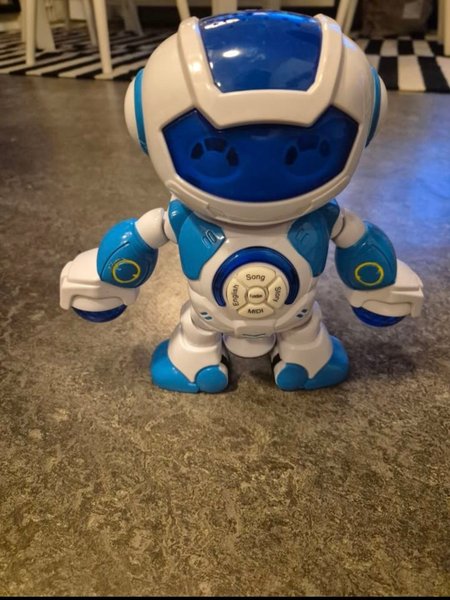Robotleksak i blått och vitt. Roboten har knappar på magen för olika funktioner som sång, berättelser och MIDI. Den har även en engelsk funktion.