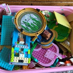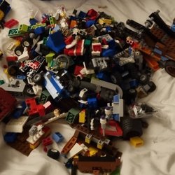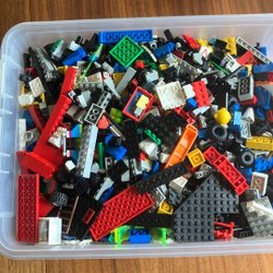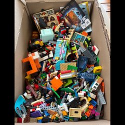 En låda full med blandade Legobitar. Perfekt för den kreativa byggaren eller för att komplettera befintliga Lego-samlingar. Innehåller en variation av färger och former.