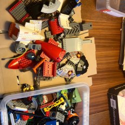 Lego i blandade färger och former. Innehåller bland annat hjul och en grön platta. Säljes i en plastpåse.