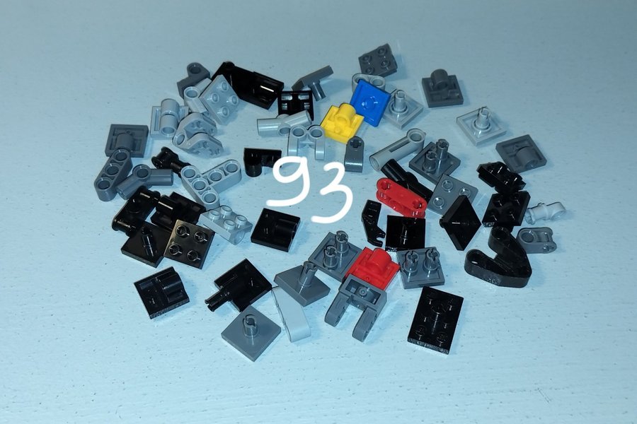 Detta set innehåller blandade LEGO Technic-delar i olika färger som svart, grått, rött, gult och blått. Delarna inkluderar plattor, gångjärn, axlar och anslutningsbitar.