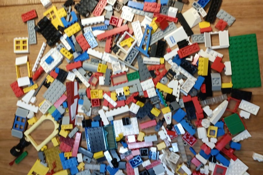 En samling av blandade LEGO-bitar i olika färger och former. Innehåller byggplattor, fönster, dörrar och standardklossar. Bitarna är av olika ålder. Några år i nyskick och andra är repiga.Alla är äkta, hela och nytvättade i maskin