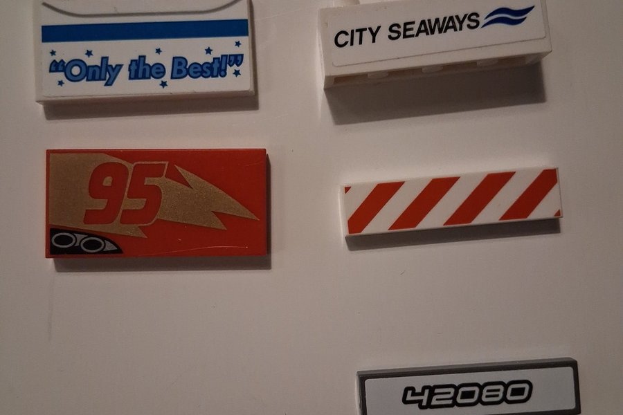Ett set med tryckta Lego-brickor. Inkluderar "Only the Best", "City Seaways", Blixten McQueen 95, varningsränder och 42080.