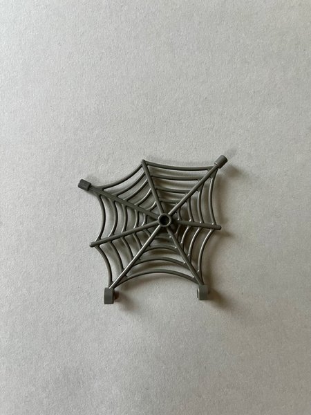 Ett grått LEGO spindelnät. Spindelnätet har en central anslutningspunkt och fyra fästpunkter runt kanten.
