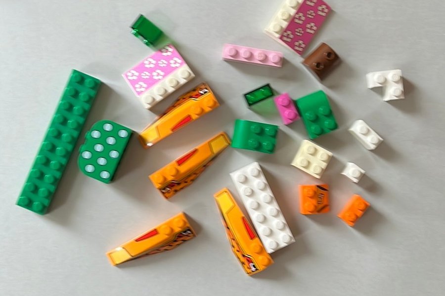 Detta parti innehåller en samling Lego-bitar i olika färger och former. Inkluderar gröna, rosa, vita, orange och bruna klossar, samt specialbitar som sluttande gula delar med tryck och en grön kloss med vita prickar.
