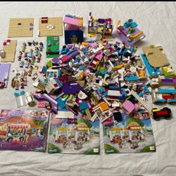 Ett stort sortiment av Lego-bitar i olika färger och former. Inkluderar basplattor, figurer och diverse delar. Perfekt för kreativa byggprojekt.