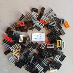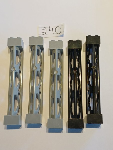 Fem Lego pelare, tre i ljusgrått och två i svart. Pelarna har en gallerstruktur och fästen upptill och nedtill.
