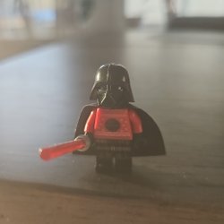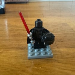 En LEGO Star Wars Darth Vader minifigur med ljussabel och cape. Hjälmen kan tas av och ersättas med ett huvud.