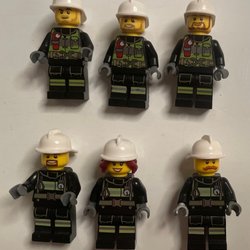 Lego set med tre brandmän och en brandpost. Inkluderar tillbehör som walkie-talkie, yxa och brandsläckare.