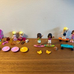 Lego figurer och diverse tillbehör. Inkluderar två figurer, blommor, spade, kastrull och stolar. Djur och rökfritt hem. Samfraktar.