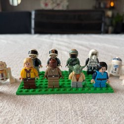 Ett parti med 22 Lego Star Wars minifigurer. Partiet inkluderar karaktärer som Mandalorian, Luke Skywalker, R2-D2, C-3PO, Snowtroopers och rebellsoldater.