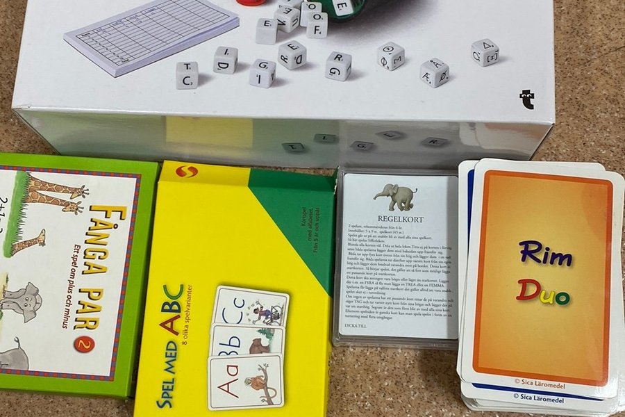 Diverse spel säljes. Inkluderar Ordleg word play, Fånga par, Spel med ABC och Rim Duo.