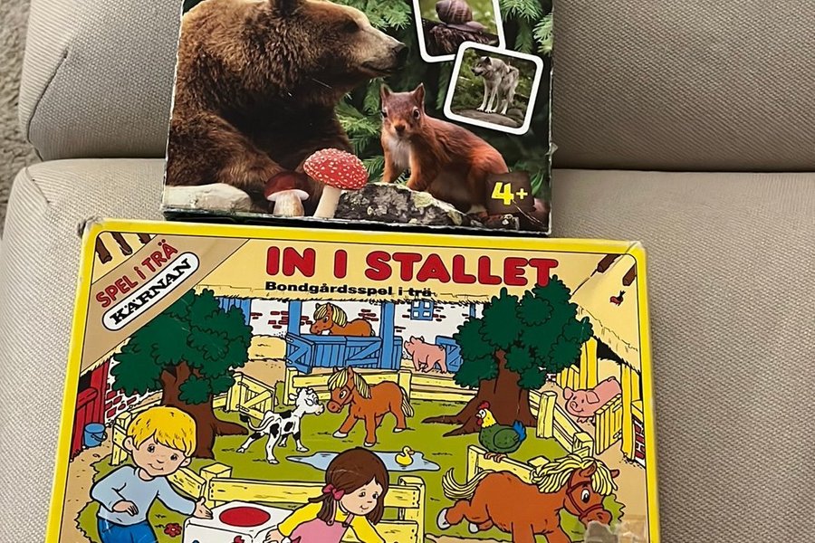 Två spel: Memo och In i stallet. Memo är för 4+ år och In i stallet är för 3+ år. Båda spelen är från Kärnan.