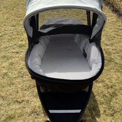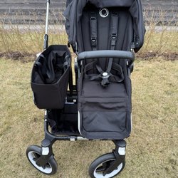 ritax sulkyvagn i svart med grön sufflett. Vagnen har fyra hjul med svängbart framhjul, vadderad sittdel med fempunktssele och bygel framtill. Ryggstödet är ställbart och suffletten ger skydd mot sol och lättare väder. Under vagnen finns en varukorg för förvaring