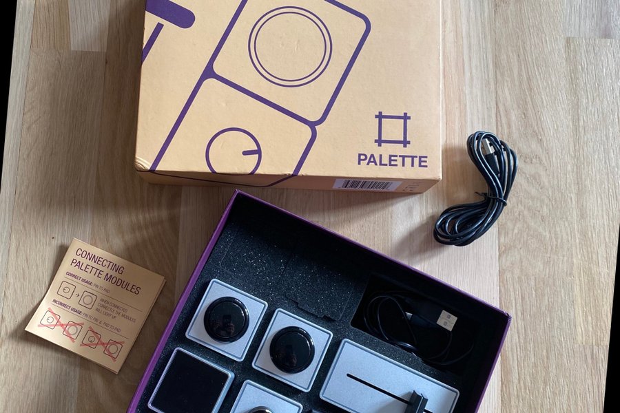 Palette Starter Kit med moduler för kreativ kontroll. Innehåller en strömkärna, två knoppmoduler, en skjutreglagemodul och en knappmodul. En USB-kabel medföljer.