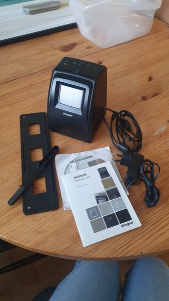 Medföljer en hållare och putspinne för diabilder, en USB-kabel, strömadapter och manual. Skannern klarar även av att skanna in negativ, dock saknar jag hållaren för det.