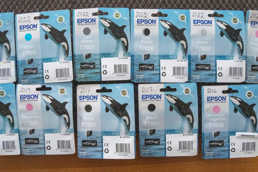 11 stycken originalbläckpatroner från Epson i obrutna originalförpackningar.